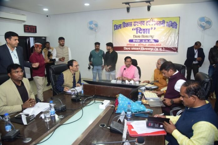 जिला विकास समन्वय एवं निगरानी समिति (दिशा) की बैठक आज जिला कार्यालय के मंथन सभाकक्ष में केन्द्रीय आवासन एवं शहरी विकास राज्य मंत्री और सांसद तोखन साहू की अध्यक्षता में संपन्न हुई। बैठक में फ्लैगशिप योजनाओं सहित जिले में संचालित विकास योजनाओं की प्रगति की गहन समीक्षा की गई। धरती आबा जनजातीय ग्राम उत्कर्ष अभियान के तहत 122 गांवों की विकास परियोजनाओं एवं अरपा भैंसाझार परियोजना सहित विभिन्न विभागीय योजनाओं की समीक्षा की गई। बैठक में विधायक धरम लाल कौशिक, सुशांत शुक्ला, दिलीप लहरिया, जिला पंचायत अध्यक्ष राजेश सूर्यवंशी, महापौर पूजा विधानी सहित जनपद एवं नगर पंचायत के अध्यक्ष एवं अन्य जनप्रतिनिधि, कलेक्टर संजय अग्रवाल, नगर निगम कमिश्नर प्रकाश कुमार सर्वे, सीईओ जिला पंचाय संदीप अग्रवाल सहित विभागीय अधिकारी मौजूद थे।